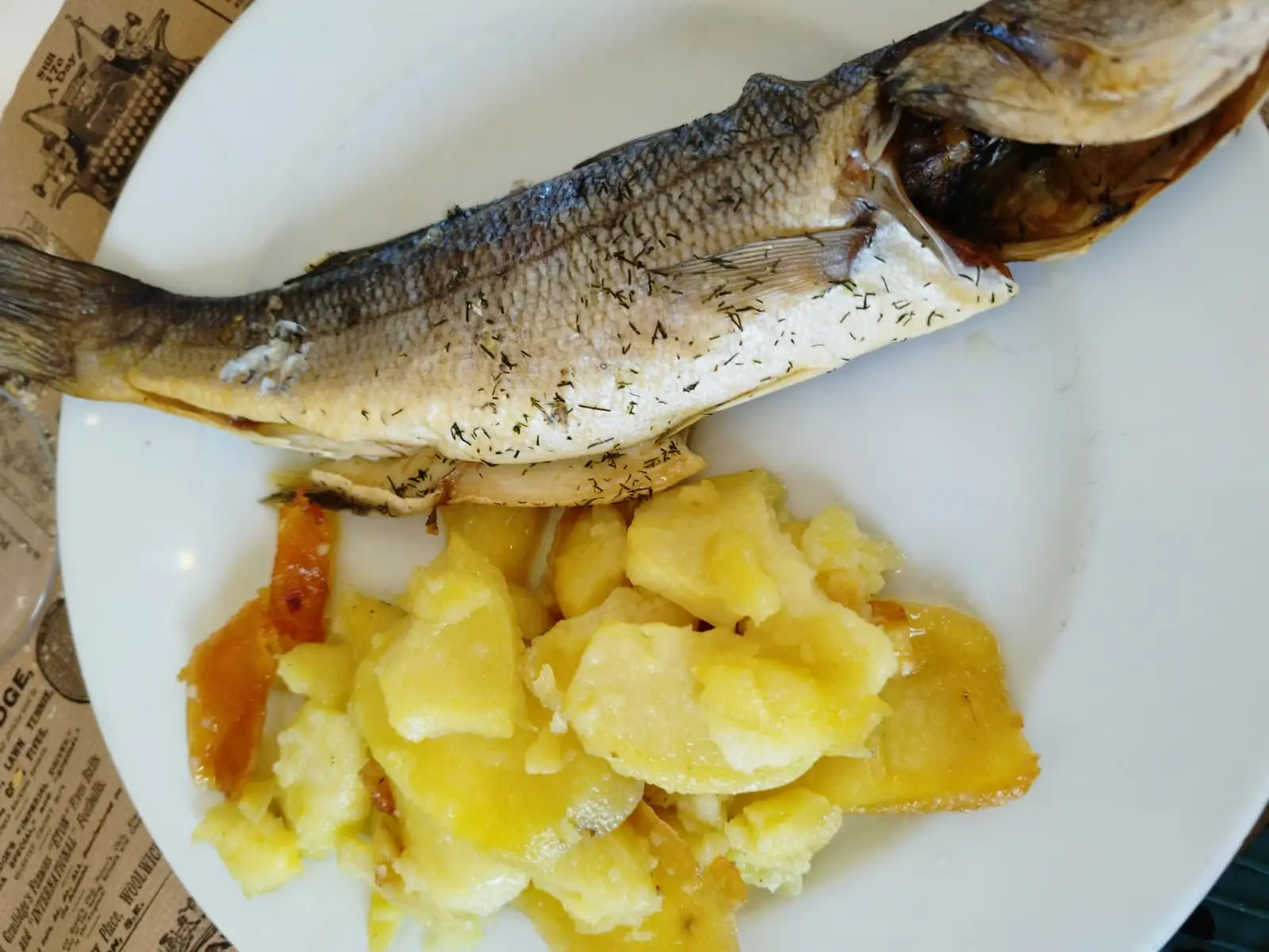 Pescado tierno y jugoso acompañado de patatas doradas, preparado de forma tradicional.