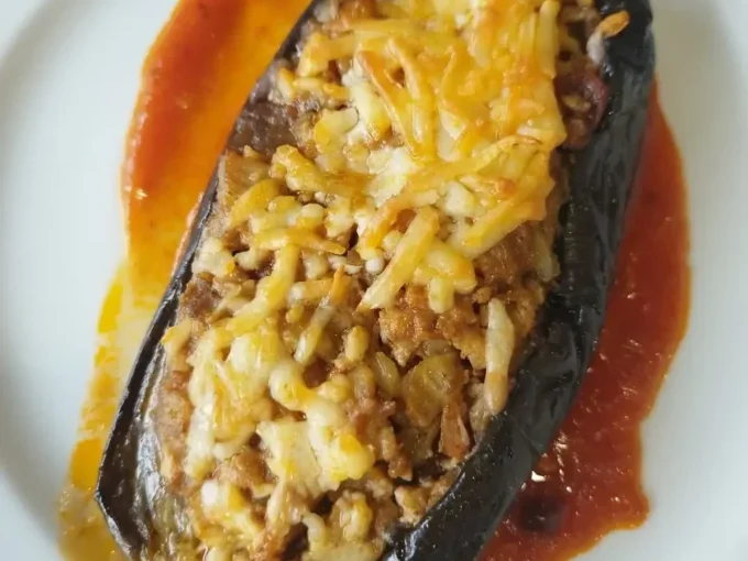 Berenjena asada y rellena de un sabroso guiso, gratinada al horno.
